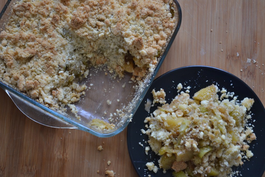 - Dans un plat allant au four, verse les légumes puis ajoute la pâte à crumble.