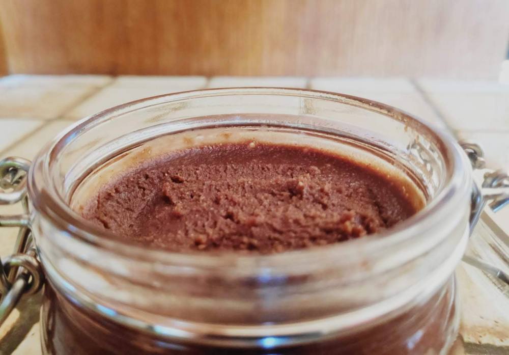 - Mixe jusqu’à obtenir une pâte homogène et liquide. Cette tâche demande beaucoup de patience. Si tu sens que la pâte se ramolit difficilement tu peux rajouter un peu d’huile (vas-y petit à petit).