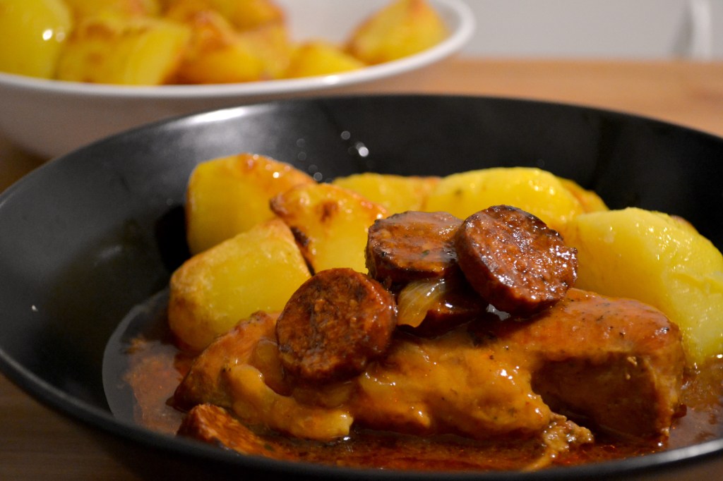 - Reserve les morceaux dans une assiette et mets ensuite oignon, ail et chorizo dans la poêle. Fais revenir 5 minutes avant d’ajouter le concentré de tomate.