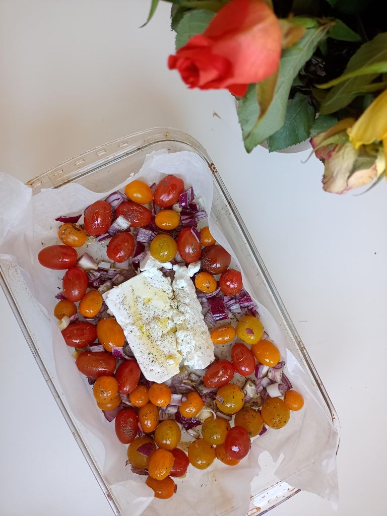 - A nouveau, mets un peu d’huile d’olive, sel et poivre sur la feta et une fois que le four est bien chaud enfourne pour 30 minutes.