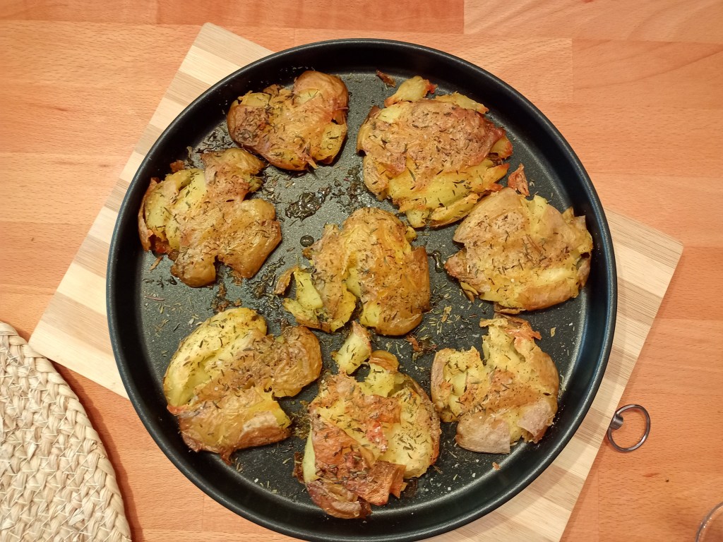 Bref ! Ici, tu retrouveras ma recette de pommes de terre écrasées, cuites au four. Pourquoi c’est super « yummy » ? Parce que la pomme de terre est croquante à l’extérieur et super fondante à l’intérieur. De plus, ça s’associent très bien avec une viande ou simplement à tremper dans une sauce en guide de snack, apéro ou autre.