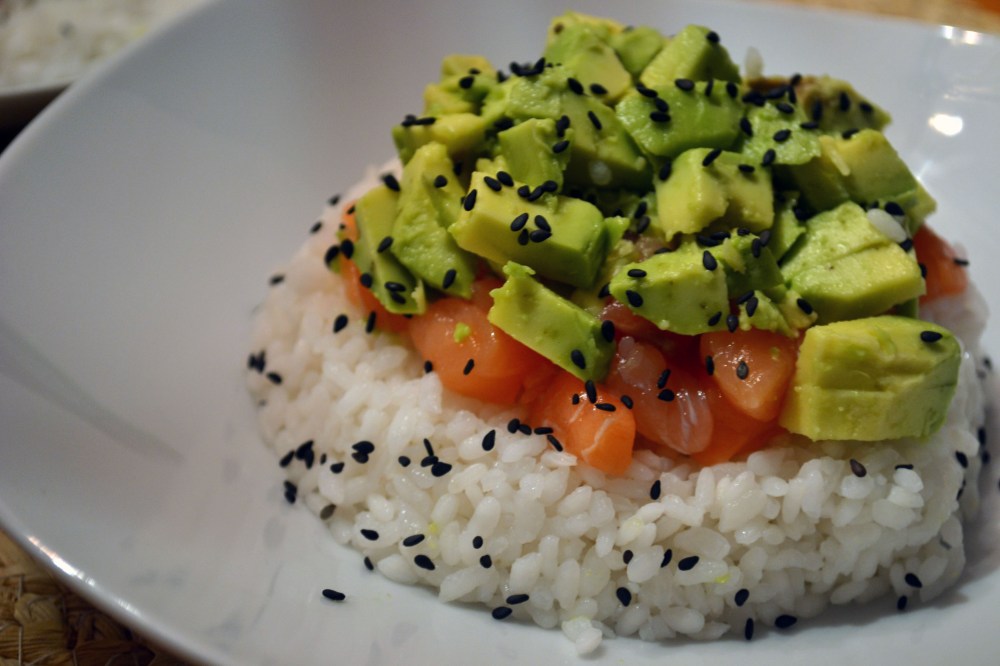 - Laisse refroidir puis dans une assiette dresse le tout : riz, saumon, avocat par dessus et enfin graines de sésames.